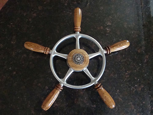 I always fancied a traditional helm for my boat April Love, so when I saw this decrepid old wheel in a scrap yard, I haggled and bought it for £4. After checking that it fitted my tapered Morse steering shaft, I set about stripping off and discarding the wooden fittings. (pics 1 & 2)